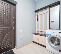 Номер с отдельным входом в коридоре подьезда: -кондиционер -кровать 1,6м -кухня с варочной панелью -холодильник -туалетная комната с душем -фен -прихожая -шкаф 2-х створчатый -пуфик -кухонный стол -стулья-2шт -чайник -телевизор -стиральная машинка -столовые принадлежности -кухонные принадлежности