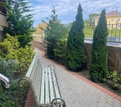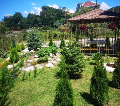 Есть кофемашина на рецепшене , можно сварить кофе и спокойно попить в затененной беседке или на лавочке в окружении цветущих растений.