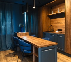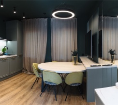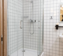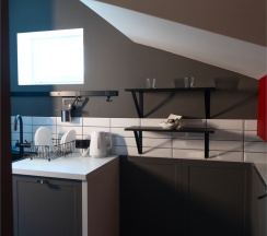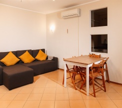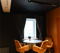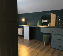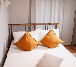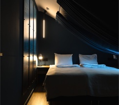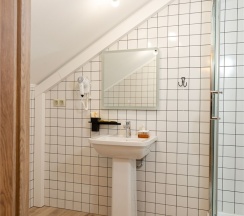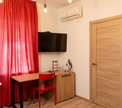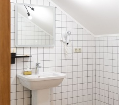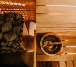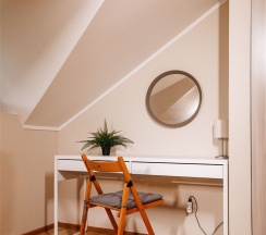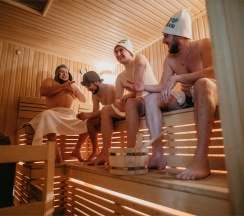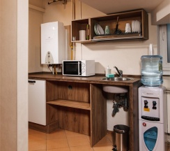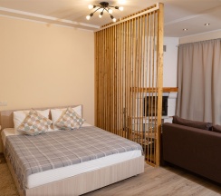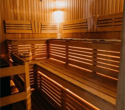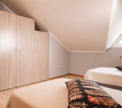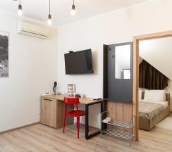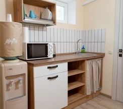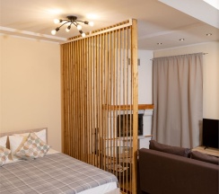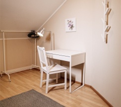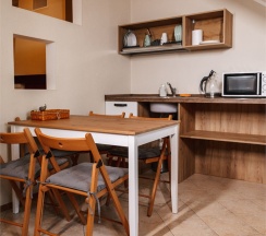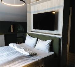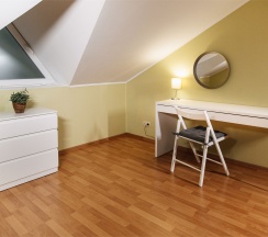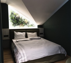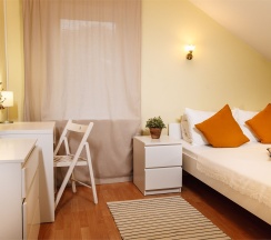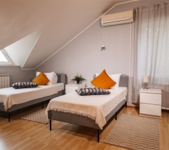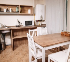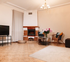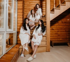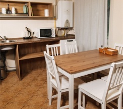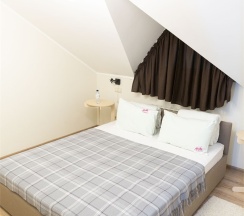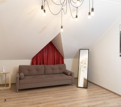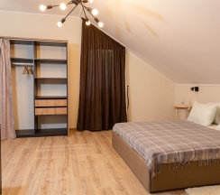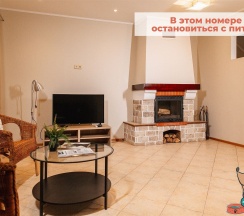 Десятиместный таунхаус, с возможностью дневного пребывания большой компании до 20-ти человек. На первом этаже расположены: теплый 6ти метровый бассейн, финская сауна, комната отдыха, веранда, раздевалки, душ, санузел. На втором этаже мансардные номера: два номера с двуспальными кроватями и три номера с двумя односпальными кроватями. Удобства находятся на этаже. Завтрак включен в стоимость.