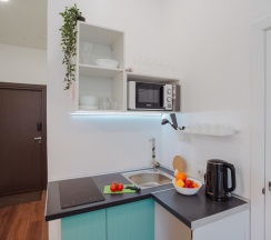 Плюсы: удобное расположение, бесконтактное заселение, просторный номер, есть все необходимое(посуда, ванные принадлежности, даже ватные диски и палочки).