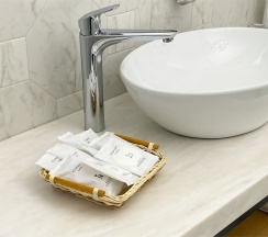 В стоимость номера входило посещение спортзала и водной зоны. Номер маленький, но уютный. Есть холодильник, телевизор, чайник и фен. Приветственный набор: чай 2 вида, кофе, горячий шоколад, вода в бутылочках. В душе: жидкое мыло, гель и шампунь в дозаторах. Есть спонжи, ватные палочки, шапочки для душа, набор для бритья и для чистки зубов. Халата и тапочек нет. Хотели купить одноразовые сланцы на ресепшен, но нам бесплатно принесли в номер одноразовые тапочки, в них мы и ходили в спа.
