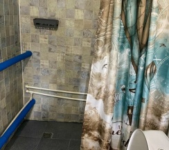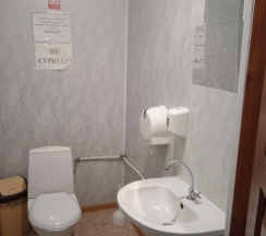 Санузел общий для всех комнат: три кабинки с туалетами и три кабинки душевых, очередей не было.