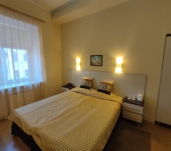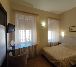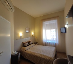 Комната с двуспальной или двумя раздельными кроватями. В комнате есть кондиционер, пробковый пол, отопление, шкаф, телевизор с плоским экраном, розетки около кровати, постельное бельё и собственная ванная комната с душевой кабиной. В ванной комнате теплый пол, предоставляется комплект полотенец, фен. Вид из окна комнаты на Большую Морскую улицу.