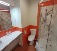 Комната с шириной кровати 140 см. В комнате есть кондиционер, пробковый пол, отопление, шкаф, телевизор с плоским экраном, розетки около кровати, постельное бельё и собственная ванная комната с душевой кабиной. В ванной комнате теплый пол, предоставляется комплект полотенец, фен.