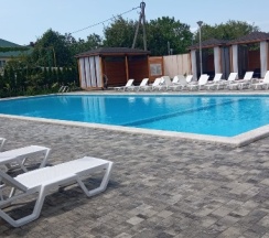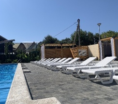 Отель понравился. Из всех, в которых был на нашем юге, этот один из лучших. Номера хорошие, уборка, смена белья раз в три дня. Есть своя парковка, достаточно большая, никто ни кого не запирает. Есть свой большой бассейн, вокруг бассейна шезлонги. Так же рядом с бассейном несколько бунгало. Есть летняя кухня, обеденная и мангальная зоны. Конечно до моря, как мне показалось далековато, но за эти деньги/сервис, лучшего не найти. Пешком неспеша идти минут 20, до пляжа Багратион. В районе можно и трансфер до пляжа найти. Кстати в отеле дают браслет пластиковый, по нему скидка 10% в столовой Эвелин.