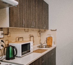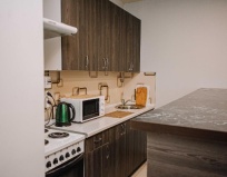 Плюсы: чисто, спокойно, уборка и сервис вовремя. Раздают фумигаторы, можно попросить удлинитель: всё дают, во всем помогают без проблем. На первом этаже — общая кухня с небольшим коворкингом. Сидел там пару раз с ноутбуком. На этажах — кулеры, микроволновки, есть доска с утюгом. Можно воспользоваться стиральной машинкой за 100 р. Рядом Дикси, рынок, хорошая пекарня, гирос-бар.