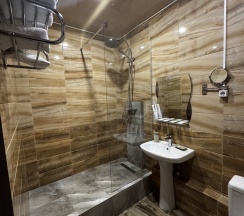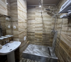 Просторный номер с одной двуспальной кроватью, телевизор, кондиционер, холодильник. Большая ванная комната с гидромассажной ванной.