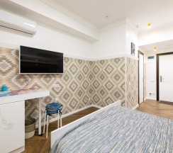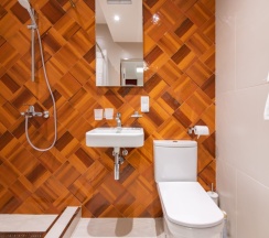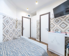 Трехместный номер с двуспальной кроватью и односпальной кроватью на втором ярусе и собственной ванной комнатой, площадью 16 кв. м., оснащенный мини холодильником, столовой посудой, смарт-ТВ, сплит-системой. Максимальное размещение – 3 человека. Размещение дополнительного гостя невозможно. Размещение с домашними животными не допускается.