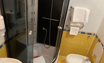 В двухместном номере 2 односпальные кровати, тумбочки прикроватные (2 шт.), стол с 2 стульями, шкаф, телевизор, холодильник, зеркало. Санузел оборудован туалетом, душем, имеются ванные принадлежности. На стенах - 2 бра.