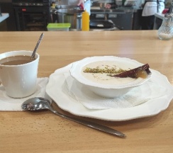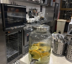 Утром и до 14 бесплатный кофе и чай. Просторная кухня,можно приобрести снеки,каши на месте.