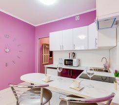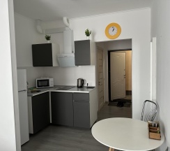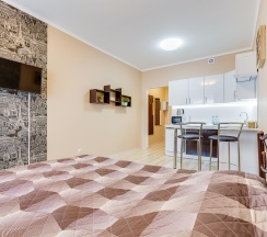 Квартира оборудована всем необходимым для комфортного проживания: в кухне имеется полный набор посуды, плита, холодильник, чайник и микроволновая печь, есть барная стойка, где можно насладиться ужином или завтраком. В ванной комнате - душ, туалет, умывальник, фен и стиральная машина. Полотенца и постельное белье уже входят в стоимость. Квартира идеально подойдет как для краткосрочного, так и длительного проживания