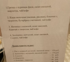 + завтрак понравился, отдельное спасибо девушкам из столовой, мы выбрали номер 2 и 3. Хотите побаловать себя еще чем-то, пожалуйста заказывайте, мини меню на столе.