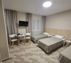 + просторный, чистый номер, плитка на полу. У нас был с тремя односпальными кроватями.