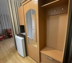 Двухкомнатный номер с коридором включающий в себя: спальню с большой кроватью; гостиную с диваном, большим круглым столом и стульями, журнальным столиком, ЖК ТВ, кондиционером, холодильником, плательным шкафом; ванную комнату с душевой кабиной, унитазом, раковиной, феном, туалетными принадлежностями (зубной набор, гель для душа, шампунь, мыло, тапочки, полотенца).