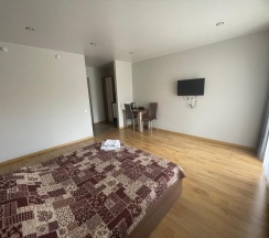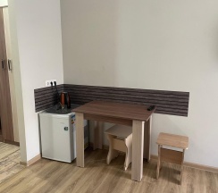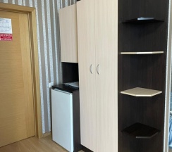 Просторный номер с двуспальной кроватью, ЖК ТВ, холодильником, плательным шкафом, столом и стульями, ванной комнатой с душем, туалетом, раковиной, туалетными принадлежностями (зубной набор, гель для душа, шампунь, мыло, полотенца, тапочки).