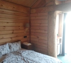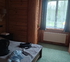 Уютная комната из дерева. Оформляют и дают ключ от холла и номера в ресторане. В холле автомат с кофе и куллер. Предлагают завтрак.
