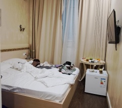 Удобное расположение, можно оставить машину во дворе за шлагбаумом. Номер небольшой, но внешне полностью соответствует фото. В номере холодильник и пара стаканов. У стойки ресепшена есть кулер с холодной/горячей водой.