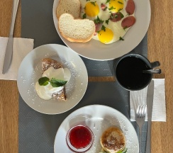 Отличный отель. Уютные и чистые номера. Имеется всё необходимое для проживания. Персонал очень доброжелательный и приветливый, с радостью ответят на все вопросы и расскажут обо всех деталях!) Есть бесплатные чай/кофе и булочки от повара, что очень приятно. Завтрак готовят на выбор к определенному времени – безумно вкусная еда и красивая подача. На территории отеля есть парковка. Местоположение отеля так же радует. Единственный минус - плохая шумоизоляция, но нам это не мешало. С радостью бы остановились в этом отеле ещё раз