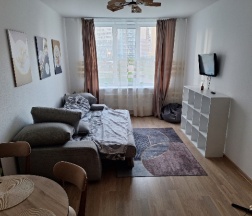 Апартаменты находятся в новом доме,что очень классно.Жил месяц и дефектов почти не нашел(только по мелочи).Звук строительства не слышал вообще.С окна видно площадку,магазины.К тому же большой плюс,что есть много парковочного места!!!!