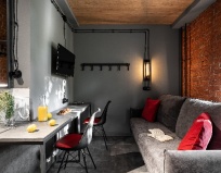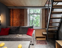 Классный интерьер в стиле лофт: высокие потолки, открытые кирпичные стены, большие панорамные окна и тщательно подобранные детали - всё создает атмосферу уюта и современного стиля.