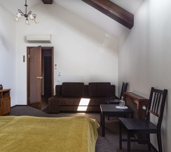 Люксы обставлены современной и удобной мебелью, располагающей к полному расслаблению и отдыху. Помимо двуспальной кровати в Люксе расположен большой двуспальный диван.