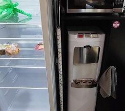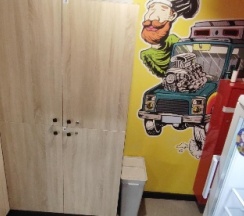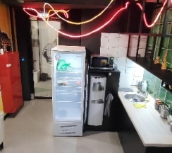 Доступ в отель бесконтактный, оплатить можно картой на месте. Общая зона - вполне себе приличная: микроволновая печь, кулер с горячей и холодной водой, кофе, чай, сахар, печенье, гладильная доска, холодильник.
