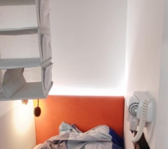 Маленький, аккуратный, уютный отель, куда смогли вместить все необходимое для комфортных ночей: туалетная комната с душем и раковиной, мини-вентилятор, прикроватная лампа, телевизор, полочки для вещей, крючки, зеркало и самое важное - кровать!