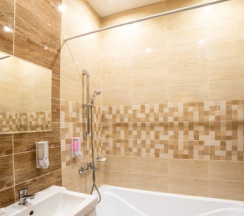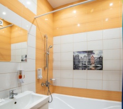 Не очень удобная душевая - одно неверное движение душем, и вода выливается на пол, несмотря на занавеску. Логичнее было бы поставить ванну, тем более что места достаточно.