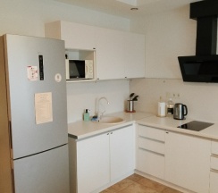 Очень уютно. Приветливый персонал, огромная кухня, отдельная спальня. Даже стиральная машина есть. Очень понравилось.