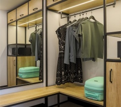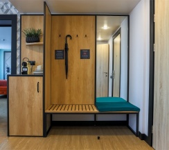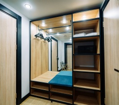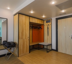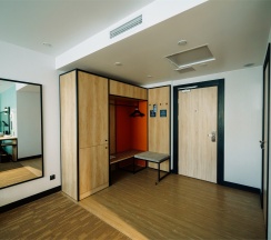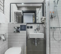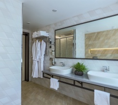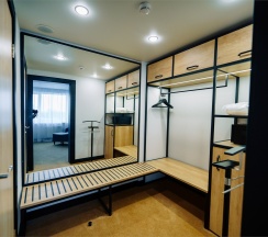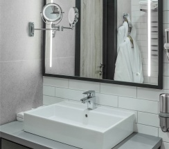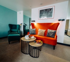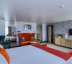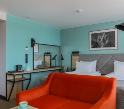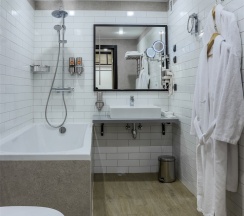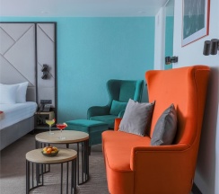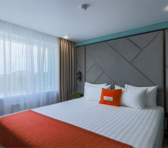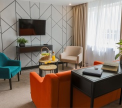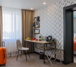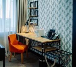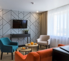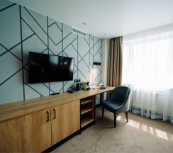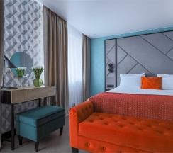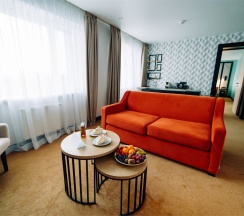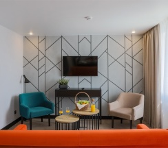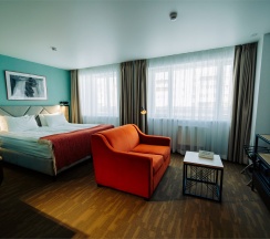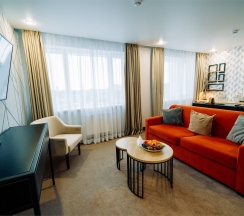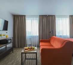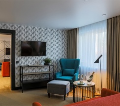Большой однокомнатный номер, объединяющий в себе выделенную зону прихожей; спальню и гостиную: двуспальная кровать, туалетный столик, выделенной рабочей зоной и зоной отдыха: уютный диван, кресла и журнальный столик, рабочий стол; просторный санузел для двоих. Капсульная кофе-машина в номере.
