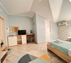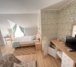 Комфортабельный, номер 28 кв м, номер с 1 двуспальной кроватью либо 2 односпальными кроватями и 2 раскладных дивана.