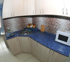В номере оборудована кухонная зона с СВЧ-печью, электрическим чайником и посудой.