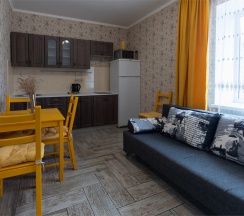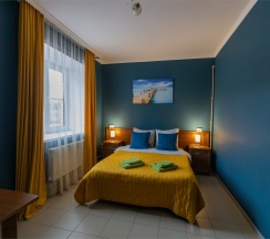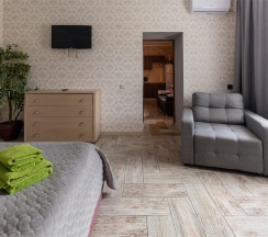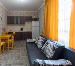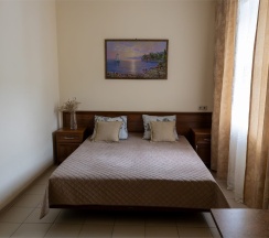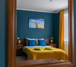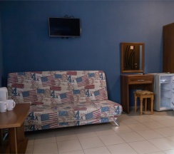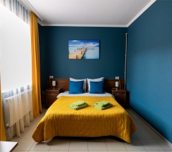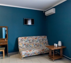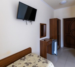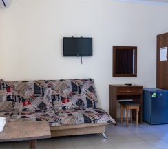 Если вы хотите отдохнуть в Сукко с комфортом и не везти с собой полдома, номер «Делюкс» — то, что надо. В нём есть всё для комфортного отдыха: холодильник, чайник и чайная пара, фен, телевизор. В «Делюксе» большая двуспальная кровать, на которую так приятно прилечь после насыщенного дня. Если гостей больше, чем двое — не проблема. В номере есть диван, который раскладывается, так что ещё двое могут разместиться. Условия подходят для длительного отдыха, командировок и отдыха даже с самыми маленькими детьми. Есть отдельный санузел, сплит и отопление, которое можно включить, если станет холодно. Свежий евроремонт, вся необходимая мебель, бытовая техника — мы постарались сделать номер «Делюкс» по-домашнему удобным, чтобы вы могли расслабиться и насладиться отдыхом.