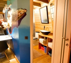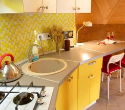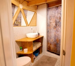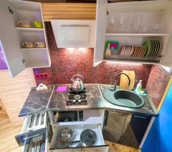 В домике есть газ плита, небольшая кухня, столовые приборы/посуда, холодильник, свч, сплит система, wifi, туалет, душевая… качественный ремонт - это редкость!