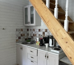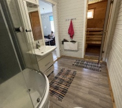 Понравилось: Замечательный просторный домик. 2 этажа. Все разместились с комфортом: четверо взрослых и двое детей. В домике два туалета: на первом и втором этажах. Душевая кабина на первом этаже. Есть вся необходимая посуда, питьевая вода есть. Хорошая уборка, достаточно полотенец, чистое постельное белье. Кухонный уголок небольшой, это понятно по фото, но это ни сколько не критично. Сауна электрическая, работает хорошо. У домика своя территория, мангал, беседка. Всё сделано для комфортного отдыха. Рядом лес, ходили за грибами. Недалеко красивый песчаный пляж, но, на мой взгляд, на автомобиле. Рекомендую.