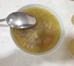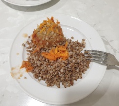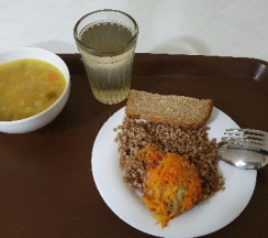 В столовой утром накормили очень вкусной Кашей и оладьями с джемом, на обеде был гороховый суп и картошка с печенью. (Я мясо не ем, но муж съел обе порции с удовольствием).