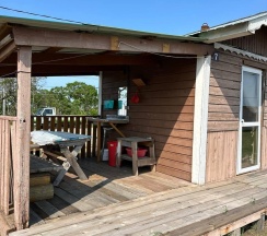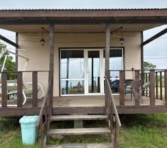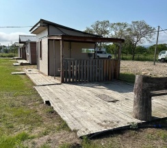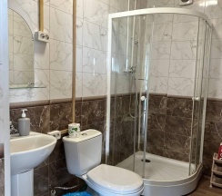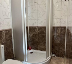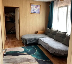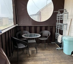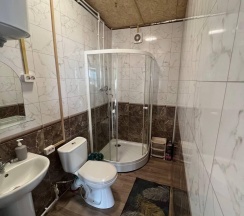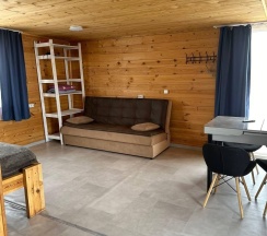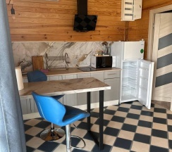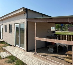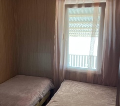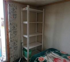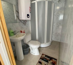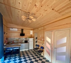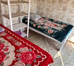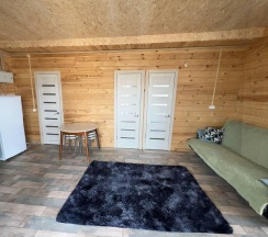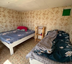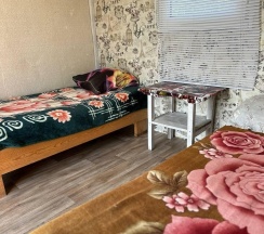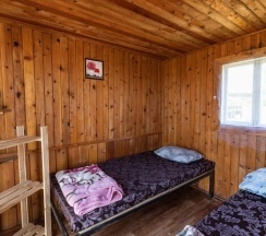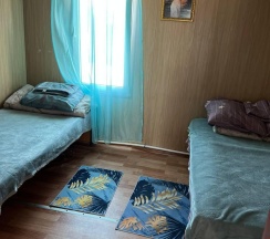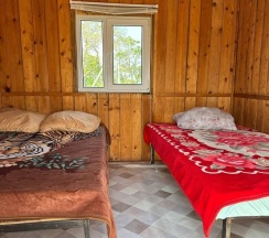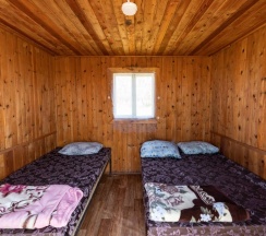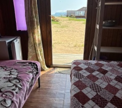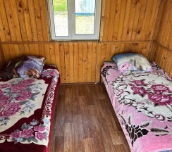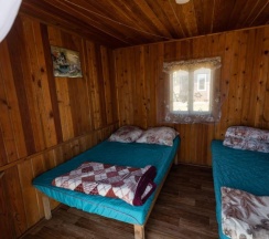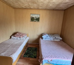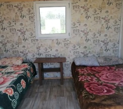 Два номера в доме с отдельным входом и общей стенкой. Площадь одного номера 12 кв.м. В домике всего 2 двуспальные кровати и 2 односпальные с удобными матрасами, холодильник, чайник, полка для вещей. К дому пристроена большая веранда. На веранде: столик, скамьи, раковина, умывальник, зеркало, розетка, светильник. В 100 метрах от домиков оборудован душ с холодной и горячей водой, комфортабельный туалет