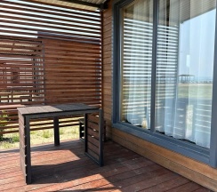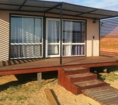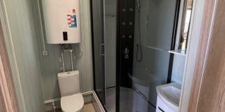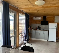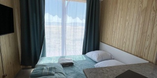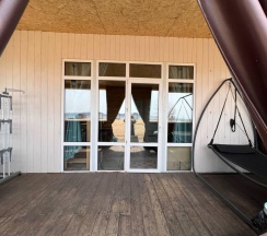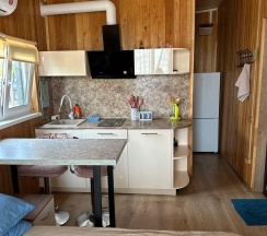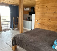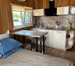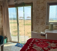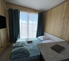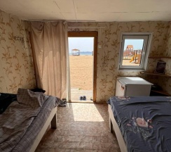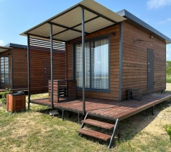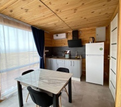 Модульный дом на первой линии, до моря всего 50 метров. В спальной зоне находятся: двуспальная кровать, тумбочка, телевизор, кондиционер. Домик оборудован кухонной зоной: кухонный гарнитур, встроенная, стеклокерамическая, двухконфорочная плита, вытяжка, чайник, раковина (холодная, горячая вода), холодильник с морозильной камерой, микроволновая печь, барная стойка и 2 стула. В доме есть вся необходимая посуда: кастрюли, сковороды, тарелки плоские и глубокие, салатник, кружки, стаканы, рюмки, бокалы для вина, заварник, турка для кофе, ключ-откупорка для металлических банок, штопор, вилки, ложки, ножи, половник, лопатки для жарки, венчик, щипцы. В ванной комнате: душевая кабина, унитаз, тумба с раковиной и зеркалом, бойлер на 80л, фен. Каждый модуль рассчитан на 2 человек и укомплектован также всеми необходимыми постельными принадлежностями (матрас, одеяло, подушки, покрывало, постельное бельё).