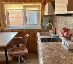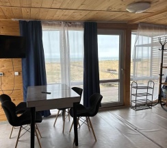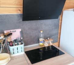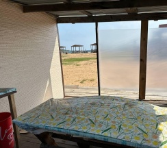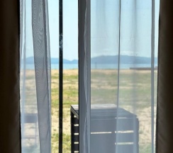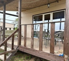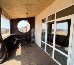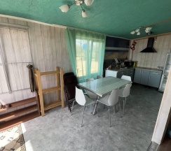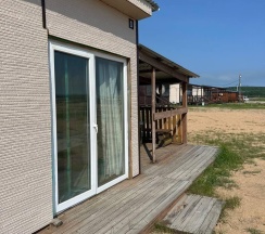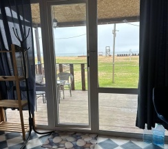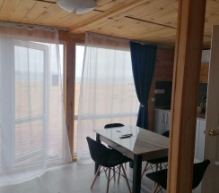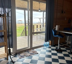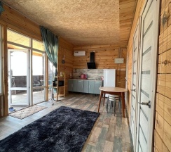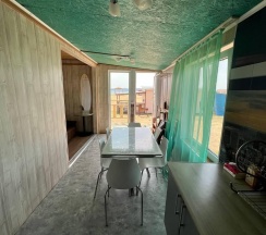 Дом с панорамными окнами, большой, закрытой от ветра верандой, в 50 метрах от моря. В доме: большая гостиная около 20 м2, с кухонной зоной, 2 небольшие спальни (около 3,5*2,5 м2) с окнами в каждой, санузел. В кухне-гостиной встроенная, стеклокерамическая, двухконфорочная плита, вытяжка, микроволновая печь, холодильник, сушилка для белья. Полный комплект посуды: 2 кастрюли на 5 и 2 литра, 2 сковороды - большая и маленькая, тарелки плоские и глубокие, салатник, кружки, стаканы, рюмки, бокалы для вина на 6 персон, чайник, заварник, турка для кофе, ситечко, поднос, ключ-откупорка для металлических банок, штопор, вилки, ложки, ножи на 6 персон, половник, лопатка для жарки. В ванной комнате: душевая кабина, унитаз, раковина, бойлер на 80л, зеркало, фен.