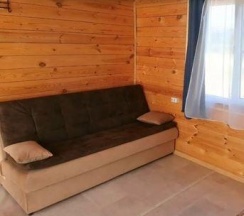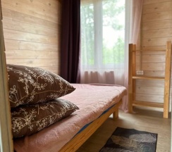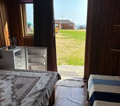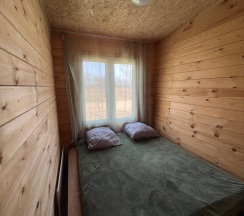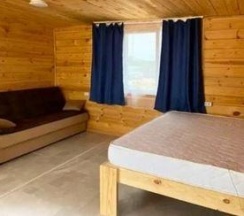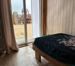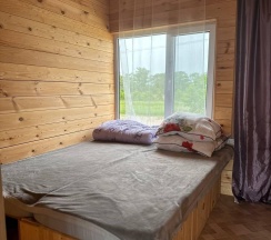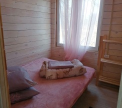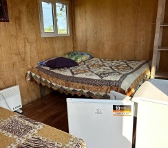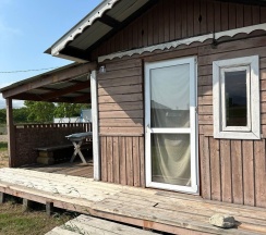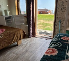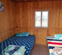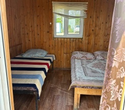 Летний домик рассчитанный на 3 гостей без удобств. В домике двуспальная и односпальная кровати с удобными матрасами, холодильник, чайник, полка для вещей. К дому пристроена большая веранда. На веранде: столик, скамьи, раковина, умывальник, зеркало, розетка, светильник. В 100 метрах от домиков оборудован душ с холодной и горячей водой, комфортабельный туалет.