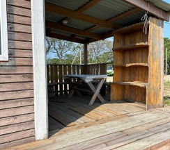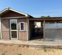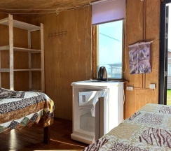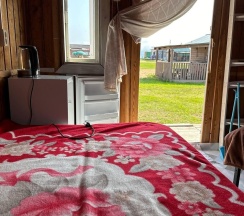 Летний домик рассчитанный на 2 гостей без удобств. В домике 2 односпальные кровати с удобными матрасами, холодильник, чайник, полка для вещей. К дому пристроена большая веранда. На веранде: столик, скамьи, раковина, умывальник, зеркало, розетка, светильник. В 100 метрах от домиков оборудован душ с холодной и горячей водой, комфортабельный туалет.