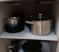 Дом с 4-мя комнатами и большой, открытой верандой, в 50 метрах от моря. В доме: большая гостиная с кухонной зоной, проходная комната с диваном, 3 небольшие спальни с окнами в каждой, санузел. В кухне-гостиной встроенная, стеклокерамическая, двухкомфорочная плита, вытяжка, чайник, холодильник, микроволновая печь. Полный комплект посуды: 3 кастрюли на 5, 3 и 2 литра, 2 сковороды - большая и маленькая, тарелки плоские и глубокие, салатник, кружки, стаканы, рюмки, бокалы для вина на 10 персон, чайник, заварник, турка для кофе, ситечко, поднос, ключ-откупорка для металлических банок, штопор, вилки, ложки,