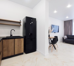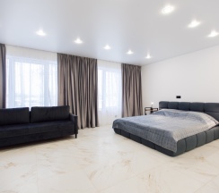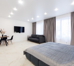 Просторный номер идеально подходит для размещения до трех человек. В номере вы найдете удобную двухспальную кровать и диван. Номер оборудован современной кухней, душевой кабиной и всем необходимым для комфортного проживания.