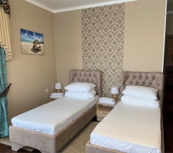 Две односпальные кровати,прикроватные тумбочки, светильники,телевизор,кондиционер,круглый стол, два стула душевая кабина, туалет, раковина. Возможно кровати ставить вместе