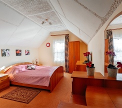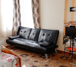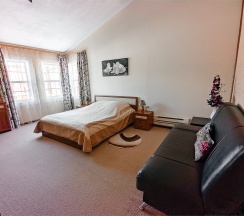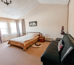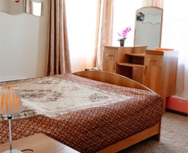 Большой номер для двоих гостей, со всеми удобствами. Большая двуспальная кровать, TV, Wi-Fi, вся необходимая мебель, холодильник. Санузел с душевой кабиной в номере.