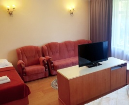 Однокомнатный номер с прихожей предназначен для комфортного размещения двоих гостей на основных местах и еще троих – на дополнительных. Приятный интерьер в классическом стиле создает атмосферу уюта и удобства. Данный номер идеально подходит как для большой компании, так и для семейной пары с детьми.