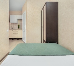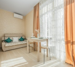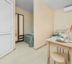 Апартаменты студия с кухней — это уютное пространство, подходящее как для двухместного проживания, так и для семьи из 3-4 человек. В номере есть двуспальная кровать шириной 140 см, отделенная перегородкой от остальной части комнаты, и удобный диван.