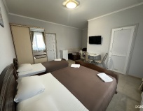 Хорошее расположение, постельное белье чистое белое, полотенца белые чистые. Бронировали номер комфорт, тумбочки и края кроватей обшарпанные, но учитывая стоимость можно на это глаза закрыть. Внизу есть кухня, все чисто посуда имеется. Холодильник, чайник в номере это очень удобно. Когда готовишь никто ничего не говорит, хозяева адекватные. Однозначно приедем еще.