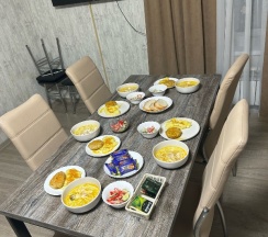 Есть и плита, и посуда, и холодильник, и микроволновка. Предоставлены халаты и наборы для умывания. Всё продумано! Для большой компании или семьи номер идеальный)