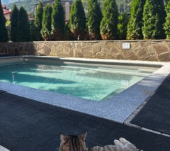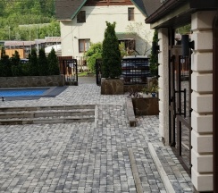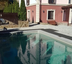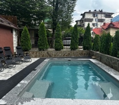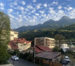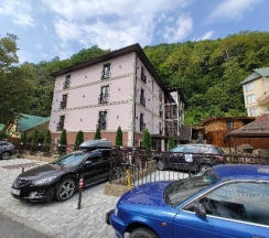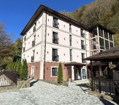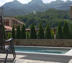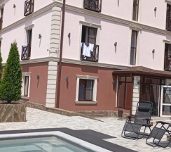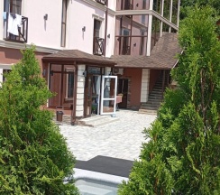 Находится недалеко от курорта, немного нужно пройти за домами. Комнаты неплохие, но маленькие, как по мне было дороговато такое. Кухни нет. Есть небольшой бассейн, баня за отдельную плату. Персонал хороший. Вид вечером красивый